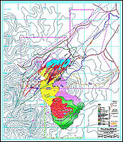 Diorite porphyries as 2m-15m wide dikes intrude into the BV. The porphyry dikes most possibly emanate as fingers from the main porphyry body at depth, and form part of the transitional intrusive contact zone between pluton and volcanic country rock. The DP is made up of >50% 2mmX3mm plagioclase phenocrysts set in fine grained to aphanitic hornblende-rich matrix. It looks very similar to the Mabuhay andesite porphyry (MAP) bodies hosting epithermal gold deposits at the MMC mine. However, the MAP at the mine site is observed to truncate porphyry copper-gold mineralization (e.g. Ntina Pit) and hosts only younger epithermal gold.